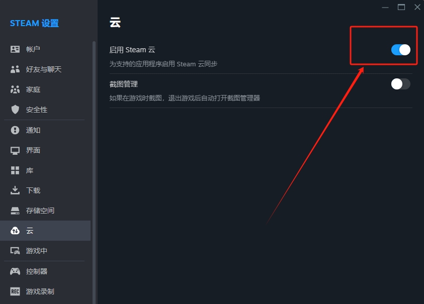 - 检查云存档设置:确保Steam的云存档功能已启用。进入Steam设置,选择“云”,确保“启用Steam云同步”选项被勾选。