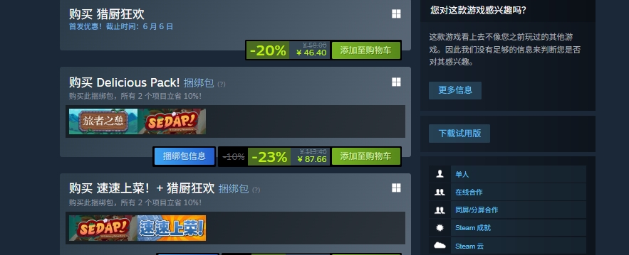 支持本地和在线合作,还有远程同乐功能——只需一个人拥有游戏,好友也能一起玩,强烈推荐拉上搭档一起开饭!游戏目前首发优惠¥46.4!